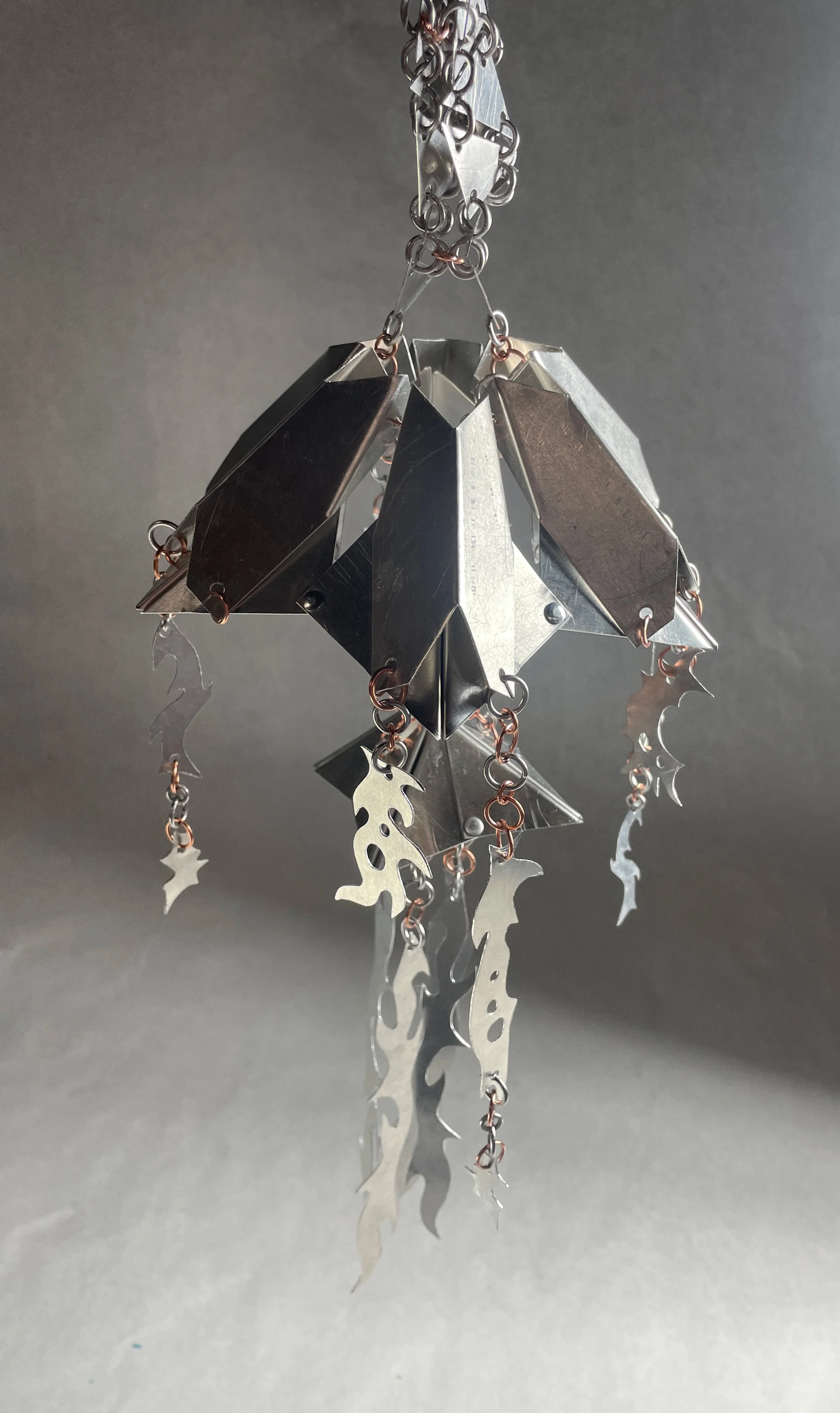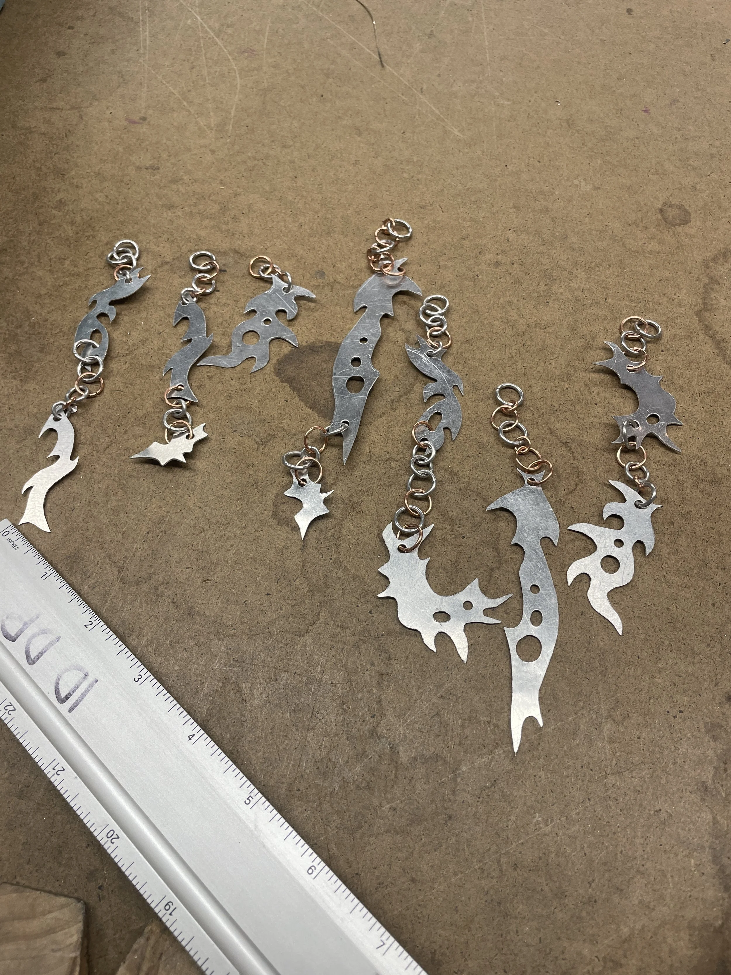 Made using jewelry saw techniques (for the cut-outs), riveting connections, and handmade jump rings.