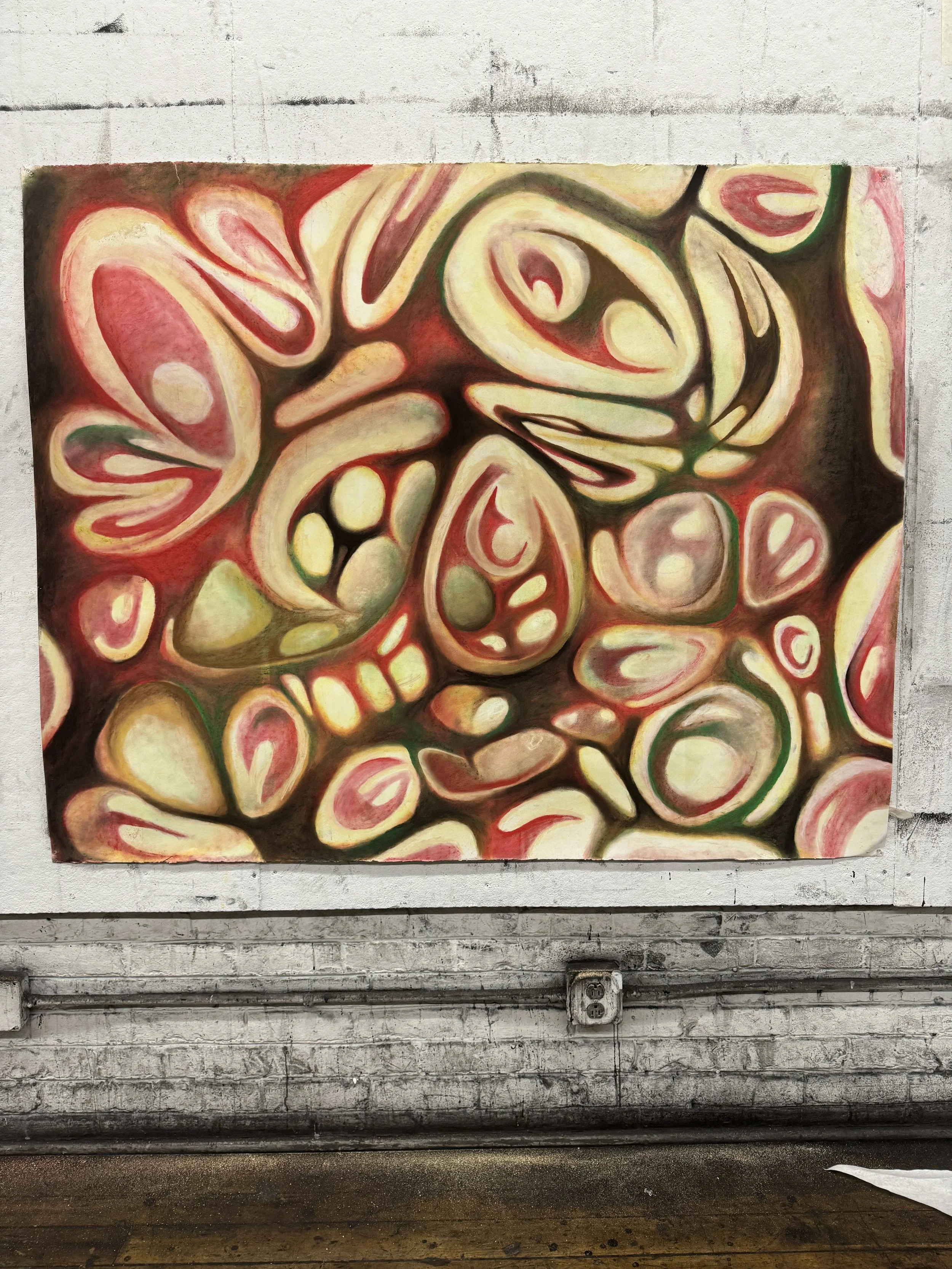 As many of my pieces work on a slightly smaller scale (18”x24” usually), this piece was a test to see if I could translate microscopic imagery or a dramatic zoom to a larger scale. I wanted this piece to have a similar radiance and fluidity like my other works, experimenting with color mixing and unique shapes.