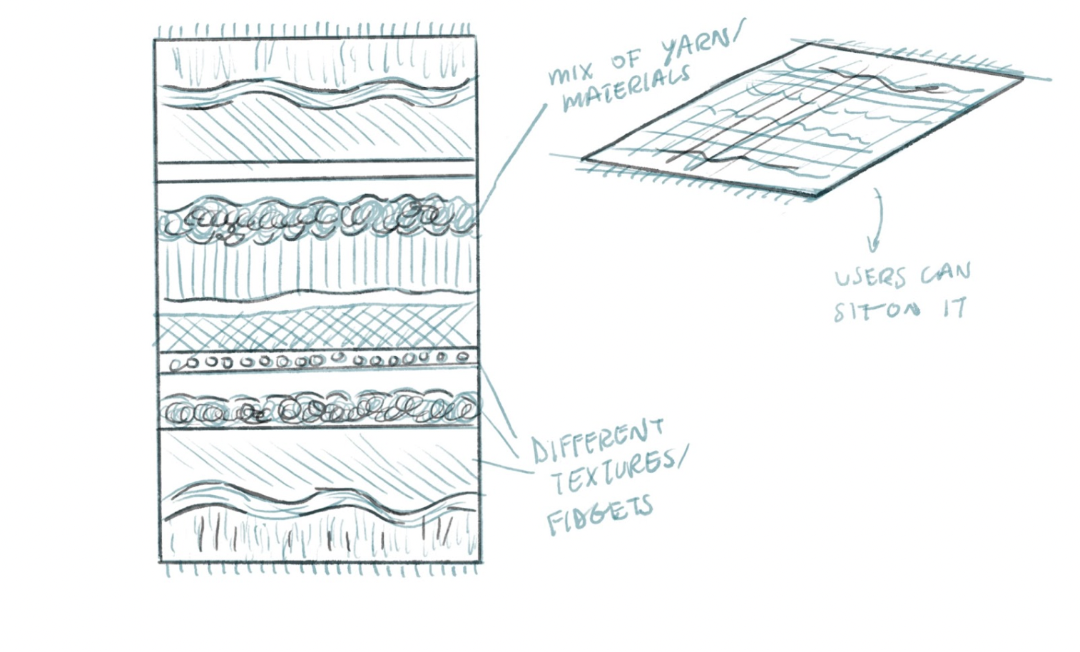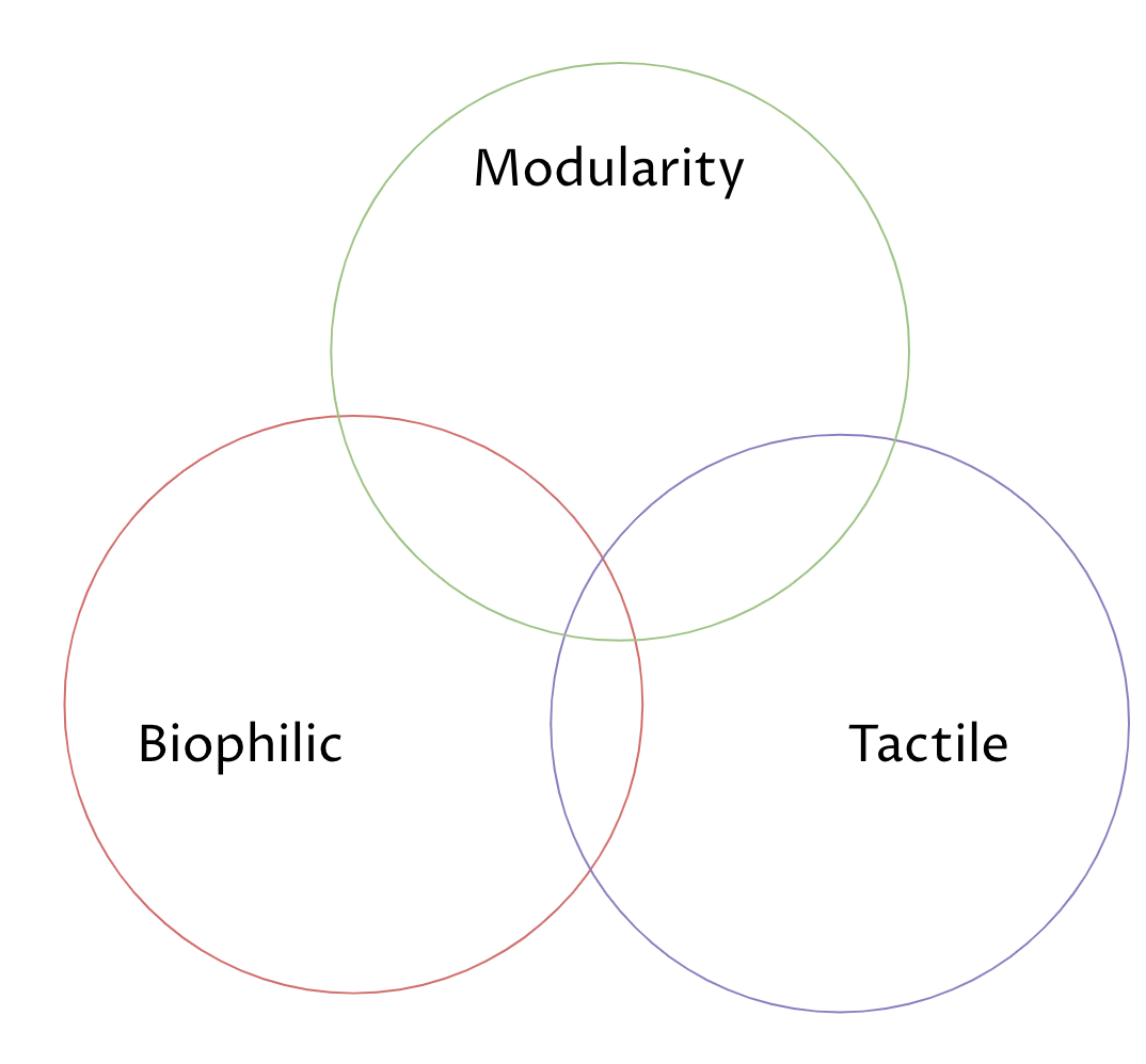 After doing research, I began my mood boards, sketching process, and patch prototypes to test out textures/colors. This stage informed much of the scale and final aesthetics that I ran with. Some of the prototypes looked purely at textiles, while others played with size in relation to the human body. I settled on 3 design opportunities: modularity, biophilia, and tactility.