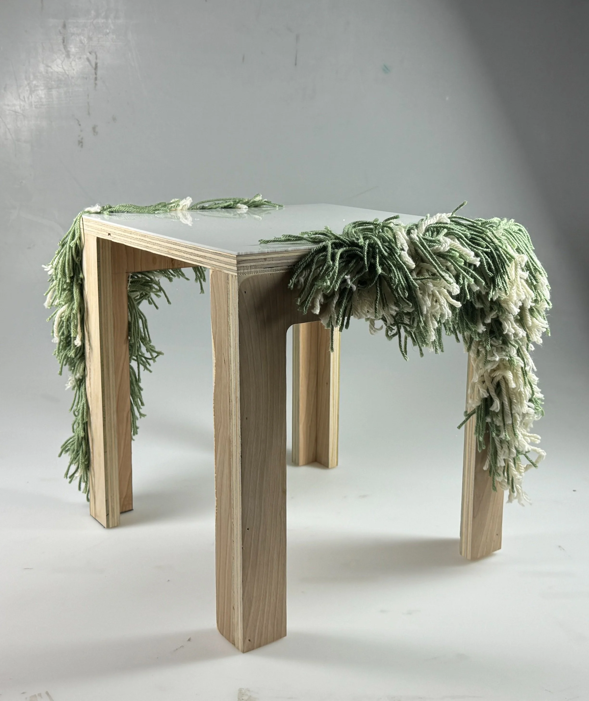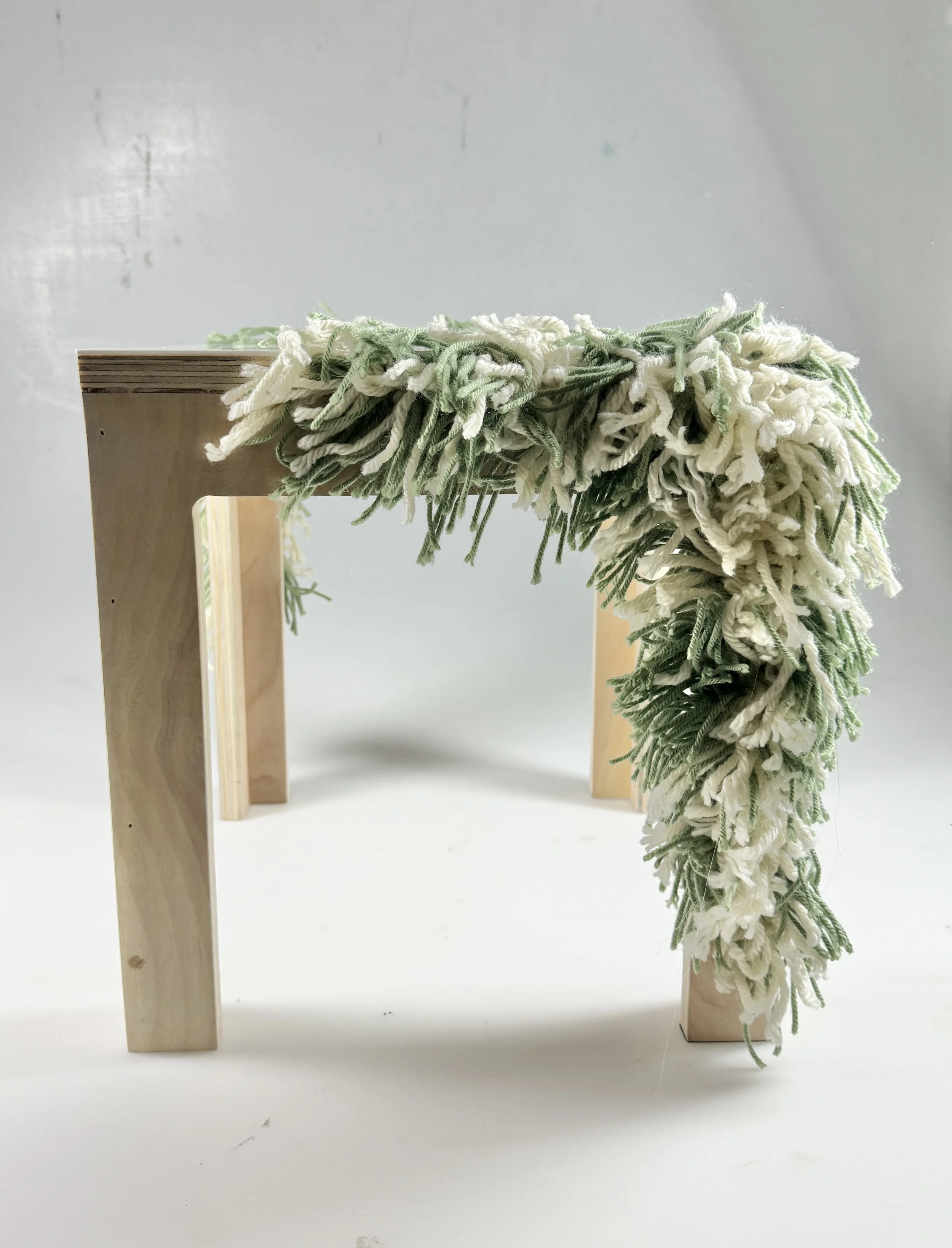 This table is a rougher prototype made quickly using scrap wood. The final form and textile elements resonate with what my planned design would look like.