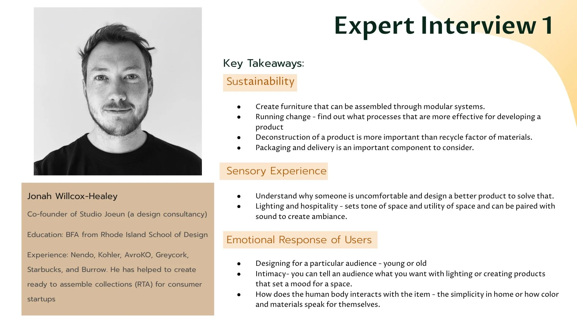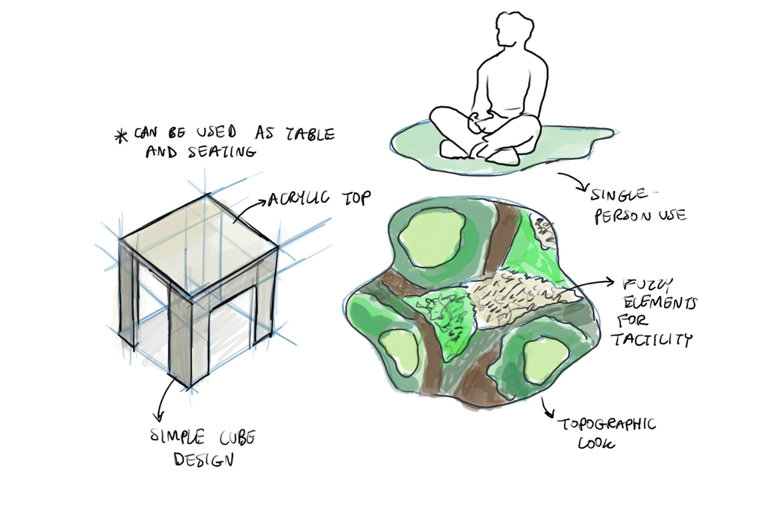 Prior to starting this project, I did some research on furniture and interior design, looking at the impact it has on individuals from a health standpoint. I was interested in how the aesthetics of a space or product can create positive emotions and stress relief for individuals, whether they live alone or with others. In the future, I would improve my final product by focusing more on form/function as I research through my design. The final results turned out to be more aesthetically driven than I had hoped.