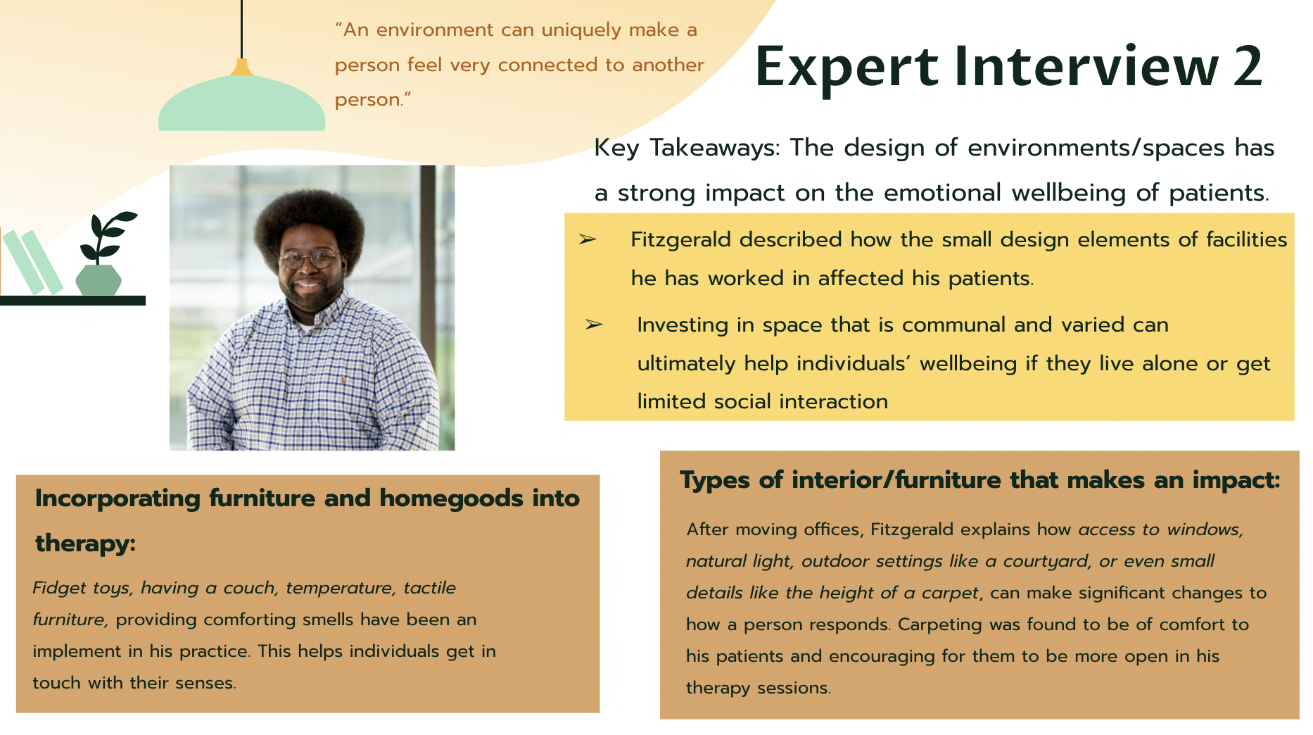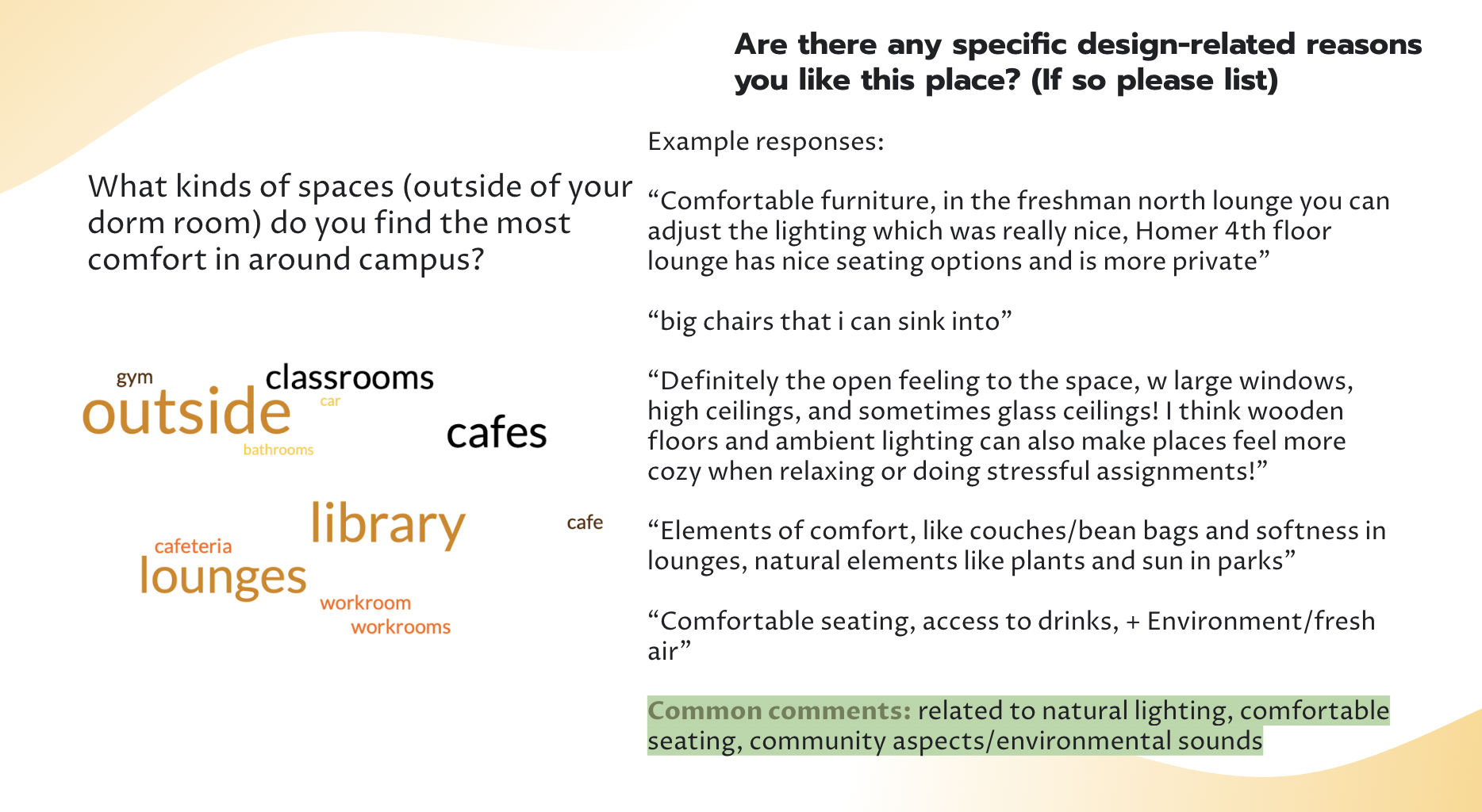 Looking into how interior design can affect individuals, I explored my college campus and talked to designers & mental health professionals as well as surveyed students.